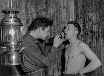 | Keywords: andre verdenskrig andreverdenskrig vårslipp 2015 vårslipp2015 frigjøring 2. verdenskrig 2verdenskrig kirkenes finnmark norge blackandwhite monochrome black and white Original bildetekst: Allerede de første dagene etter befrielsen av Kirkenes meldte omlag 1.500 nordmenn seg som frivillige til de norske styrkene. Under ledelse av norske offiserer tok de straks opp trening og vaktarbeide i de befriede områder. Bildet er tatt under legeundersøkelsen, som foregår i en forhenværende tysk brakke under ytterst primitive forhold. En stor petroleumslampe er den eneste lyskilde, trengs mer må lommeløkta tas i bruk. Fotograf: Ole Friele Backer Arkivreferanse: NTBs krigsarkiv i Riksarkivet (RA/PA-1209/U/Uj/L0214) Original bildetekst: Allerede de første dagene etter befrielsen av Kirkenes meldte omlag 1.500 nordmenn seg som frivillige til de norske styrkene. Under ledelse av norske offiserer tok de straks opp trening og vaktarbeide i de befriede områder. Bildet er tatt under legeundersøkelsen, som foregår i en forhenværende tysk brakke under ytterst primitive forhold. En stor petroleumslampe er den eneste lyskilde, trengs mer må lommeløkta tas i bruk. Fotograf: Ole Friele Backer Arkivreferanse: NTBs krigsarkiv i Riksarkivet (RA/PA-1209/U/Uj/L0214) |