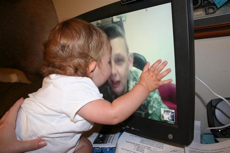Keywords: Frocking becomes Family affair DVIDS108883.jpg en Lt Col Nathan Blood brigade effects coordinator for 4th Brigade Combat Team 10th Mountain Division Light Multi-National Division “ Baghdad and his 16-month-old daughter Mackenzie kiss computer images of one another during a Web camera communication Blood kissed Mackenzie from the forward operating base and she kissed her dad from Fort Polk La 2008-08-16 Sgt 1st Class Matthew Meadows https //www dvidshub net/image/108883 108883 2008-08-16 09 43 FORWARD OPERATING BASE LOYALTY IQ 5 PD-USGov Fort Polk Images from DoD uploaded by Fæ |