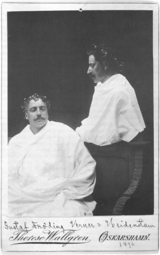| Keywords: Fröding and Heidenstam dressed in togas 1896.jpg Authors Gustaf Fröding and Verner von Heidenstam dressed in togas the day after Heidenstams marriage at BlÃ¥ Jungfrun Gustaf Fröding och Verner von Heidenstam klädda i togor hos en fotograf i Oskarshamn Det är dagen efter Heidenstams bröllop pÃ¥ BlÃ¥ Jungfrun Germund Michanek FrÃ¥n Frödings värld Wikien 1992 ISBN 9171331301 1896-08-29 Therese Wallgren 1859 ˆ’1942 Oskarshamn PD-Sweden-photo PD-old-auto-1923 1942 1896 portrait photographs Verner von Heidenstam 1896 Gustaf Fröding 1896 Toga Oskarshamn 1896 1896 in Oskarshamn August 1896 in Sweden |
