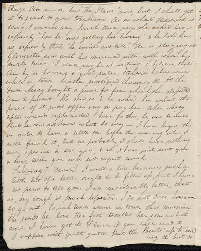 | Keywords: From Anne Warren Weston to Deborah Weston; Friday, January 6, 1837 p2.jpg Page p 2 Call Number Ms A 9 2 v 9 n 5 Format Autograph Letter Signed Extent 4 p 8 1/8 x 6 1/2 in Creator Weston Anne Warren 1812-1890 Date of creation 1837-01-06 Place of creation Boston MA Recipient Weston Deborah 1814-1889 Place of receipt New Bedford MA BPL department Rare Books Transcription Ange Ammidon has The Slave now but I shall get it to send to you tomorrow As to what Hildreth is doing I cannot say Sarah Ann says she asked him expressly how he was getting his living he told her as expressly that he would not tell He is staying at Gloucester now with his married sister with whom his mother lives I dare say he is writing I believe that Archy is having a good sales Stanton ™s behavior while in town rather mortified Chauncy Pl At the Fair Mary bought a purse for him which she deputed Ann to present She did so he asked her what the price of it was offering to pay her When Mary afterwards upbraided him for this he exclaimed that he did not know what to say “ I have begun this in order to have a little done before this evening when I will finish it but as probably I shall have nothing very special to tell you as I have just sent you a long letter you will not expect much Saturday 7 Dear D I write a line because such a little bit of a letter ought to be filled up but I have no news to tell you I am considerably better that is my cough is much lessened I do not dare however to go out Sarah Ann came in town this morning She sends her love Her foot troubles her somewhat now I have got the Slave you will read it I suppose with great gusto Put the Bents up to reading it but do Flickr data on 2011-08-02 Camera Sinar AG Sinarback 54 FW Sinar m Tags dc identifier 08_07_000010 License CC BY 2 0 User Boston Public Library BPL Flickr http //flickr com/photos/24029425 N06/2653130846 From Anne Warren Weston to Deborah Weston; Friday January 6 1837 2008-07-08 15 38 41 creator Anne Warren Weston PD-old-100 User Flickr upload bot/upload 23 38 2 August 2011 UTC Fæ CC BY 2 0 Anne Warren Weston anti-slavery letters Photos uploaded from Flickr by Fæ using a script Taken with Sinarback 54 |