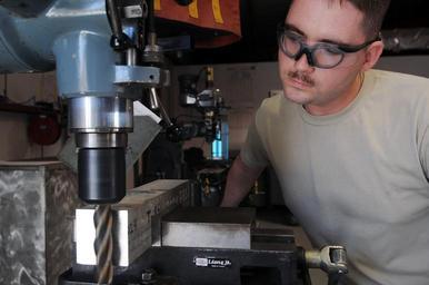 | Keywords: From Cold, Plain Sheets of Metal to Shiny, New Aircraft Parts DVIDS283486.jpg en Senior Airman Jesse Dillard 332nd Expeditionary Aircraft Maintenance Squadron metal technician uses a mill to face down an aluminum block at Joint Base Balad Iraq May 21 The squadron's fabrication flight is composed of Airmen from three career fields -- structural maintenance metals technology and nondestructive inspection Their jobs are to maintain and fabricate aircraft components to keep planes in the air Airman Dillard is a native of Haltom City Texas and is deployed form Little Rock Air Force Base Ark 2010-05-21 Senior Airman Brittany Bateman https //www dvidshub net/image/283486 283486 2010-05-27 03 17 JOINT BASE BALAD IQ PD-USGov Little Rock Air Force Base Joint Base Balad Images from DoD uploaded by Fæ |