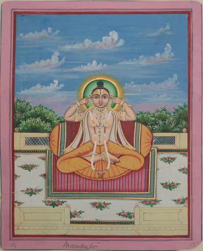 | Keywords: From a series of Vishnu Avataras- Yagya.jpg From a series of Vishnu Avataras Yagya Jaipur circa 1860 Opaque watercolour with gold on used ledger paper 24 1 x 19 2cm This avatara is belongs to the classifications extending beyond the Dasavataras of 10 The Contemporary English inscriptions front and back must be the original owner's interpretation of Manvantara Millions of years ago during the time of Svayambhuva Manvantara Indra king of the gods was absent so Vishnu took the form of Yajna to hold his post Yajna is shown using a mudra hand gesture which blocks the sense of hearing similar to yoni mudra which blocks all five senses Ledger sheets were commonly recycled to use for painting at the time due to the high cost of wasli the hand made paper specifically for paintings Used ledger paper was pasted together in the same manner as the rag-paper pasted together to form wasli My thanks to the kindness of Tarum Pant for identifying this avatara 1860 http //www indianminiaturepaintings co uk/Jaipur_Avatara_Yagya_231111 html author PD-Art Avatar Uploaded with VicuñaUploader |