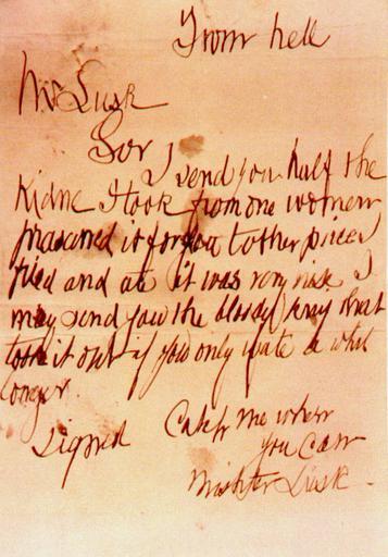 Keywords: FromHellLetter.jpg The From Hell Letter postmarked 15 October 1888 Original in the Records of Metropolitan Police Service National Archives MEPO 3/142; this facsimile from http //www casebook org/ripper_letters/ 1888-10-16 author credited to Jack the Ripper This original work is in the public domain because it was created over 120 years ago by an anonymous writer whose identity will never be known and Crown copyright in material held in public record repositories is waived http //www nationalarchives gov uk/information-management/our-services/copyright-guidance htm link Consequently this photographic representation of the work is also in the public domain Transcription The following is a verbatim transcription of the letter For example misspellings are preserved upper and lower cases are used as in the letter and punctuation is as in the letter <poem style border 2px solid d6d2c5; background-color f9f4e6; padding 1em; max-width 18em > From hell Mr Lusk Sor I send you half the Kidne I took from one women prasarved it for you tother piece I fried and ate it was very nise I may send you the bloody knif that took it out if you only wate a whil longer signed Catch me when you can Mishter Lusk </poem> PD-old 1888 letters Jack the Ripper ImageNote 1 290 11 318 99 678 972 2 from hell ImageNoteEnd 1