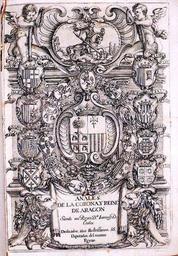 | Keywords: Frontispicio de los Anales de la Corona y Reino de Aragón de Uztarroz.jpg es Frontispicio de los Anales de la Corona y Reino de Aragón de Juan Francisco Andrés de Uztarroz En el centro el Escudo de Aragón rodeado en su corona exterior por de arriba a abajo y de izquierda a derecha por los de Cataluña Valencia Nápoles Neopatria Mallorca Sicilia Jerusalén y Cerdeña; y en la Corona interior por los emblemas de desde arriba en el centro y en sentido contrario a las agujas del reloj Zaragoza Huesca Jaca Barbastro Daroca Borja Alcañiz Teruel Calatayud Albarracín y Tarazona http //www derechoaragones es/es/catalogo_imagenes/grupo cmd posicion 189 path 1269 forma presentacion pagina config_zoom S Juan de Renedo grabado herederos de Pedro Lanaja editor Juan Francisco Andrés de Uztarroz texto 1663 Escudo de Cataluña 1663 jpg PD-old-100 Coats of arms of the crown of Aragon Frontispieces from Spain Historical images of Aragon Coats of arms of Aragon Coats of arms of the Kingdom of Aragon 1663 Literature of Spain Spain in the 1660s |