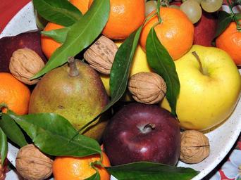 Keywords: fruit apple pera orange tangerine grapes walnut leaves foods food