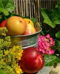 Keywords: fruit fruits garden summer refreshment vitamins colorful pear peach leaves color still life enjoy
