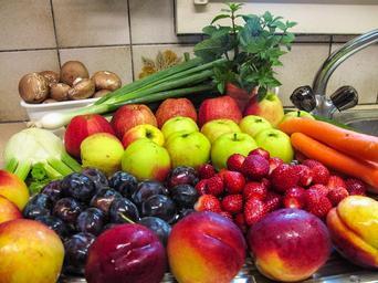 Keywords: fruit fruits mushrooms herbs peppermint german onions spring onions fennel apple carrots strawberries plums nectarines kitchen vegan weekly shopping vitamins food delicious