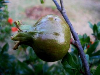 Keywords: fruit pomegranate round plump green shiny stem branch leaves garden