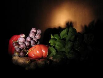 Keywords: fruit still nature mature tomato grapes composition basil shadow light the darkness light and shadow dark shadow play
