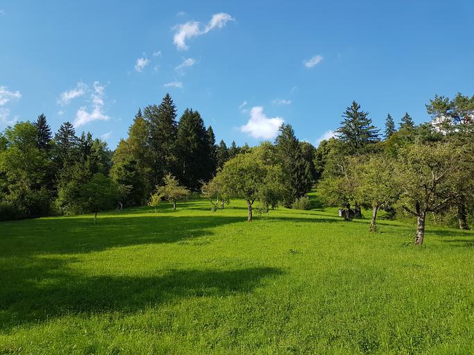 Keywords: fruit trees spruce summer meadow meadow pasture sky mountain meadow summer nature landscape grass green bavaria alpine foothills of the alps upper bavaria shadow
