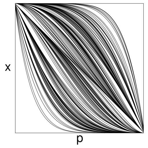 | Keywords: Fubini Nightmare foliation Katok example.svg en Fubini Nighmare foliation example due to Katok Own Actually I've used C++-program to produce Asymptote source See ru ÐšÐ¾ÑˆÐ¼Ð°Ñ Ð¤ÑƒÐ±Ð¸Ð½Ð¸ Russian for details on the algorithm I hereby release the following source code into the public domain You have to do the following in order to produce an svg file assuming the file above is saved as 'fubini C' g++ fubini C -o fubini /fubini > fubini asy prepare a cup of coffee here it's a long calculations with default options asy fubini asy pstoedit fubini eps fubini svg Ilya Voyager 2009-07-03 Other fields Asymptote + C include <iostream> include <math h> include <vector> include <time h> include <stdlib h> include <assert h> using namespace std; double F double p vector<int> a int N assert p>0 p<1 ; int i; double x 0; double q 1-p; for i 0;i<N;i++ if ai 1 x+ q; q p; else q 1-p ; return x; main srand time NULL ; vector<int> a; double prec 2E-3; int N int 1/ prec prec ; int exp 500; int i j; double p; bool first true; cout << import graph;\nimport math;\nimport fontsize;\nunitsize 7inch ;\ndefaultpen 0 45mm ;\n << endl; for i 0;i<exp;i++ a clear ; for j 0;j<N;j++ a push_back rand 2 ; first true; for p 2 prec;p<1-2 prec;p+ prec if first cout << draw ; first false; else cout << -- ; cout << << p << << F p a N << ; cout << ; << endl; cout << xaxis \ p \ BottomTop fontsize 48 ;\nyaxis \ x \ LeftRight fontsize 48 ; << endl; CC0 Dynamical systems Images with C++ source code Guido Fubini |