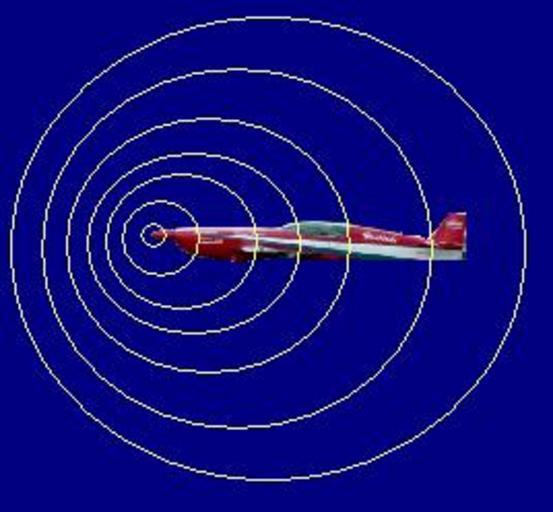 Keywords: Fuente Subsónica.JPG En la imagen se aprecia el comportamiento de los frentes de onda emitidos por un avión cuando este viaja a velocidad subsónica 2006-07-10 own assumed FedeT Aerodynamics diagrams Mach number