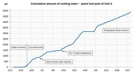 | Keywords: Fukushima I spent fuel pool 4 cooling water March-May 2011 en.svg en Cumulated amounts of water sprayed onto and into the spent fuel pool of Fukushima I nuclear power plant from March 20 to May 28 2011; data from http //www nisa meti go jp/english/ NISA reports own PM3 2011-06-01 German File Fukushima I spent fuel pool 4 cooling water March-May 2011 svg Cc-zero Data graphs relating to the Fukushima I Nuclear Power Plant | ||||