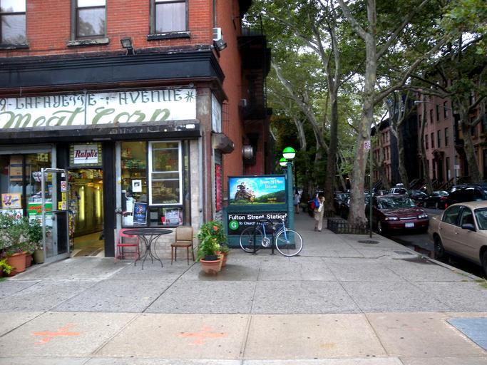| Keywords: Fulton St G sta Moes jeh.jpg en Looking north across Lafayette at stair for Fulton Street station on a rainy afternoon own Jim henderson 2010-08-22 40 41 13 7 N 73 58 28 8 W alt 0_source exif_heading NbW Cc-zero Fulton Street IND Crosstown Line |