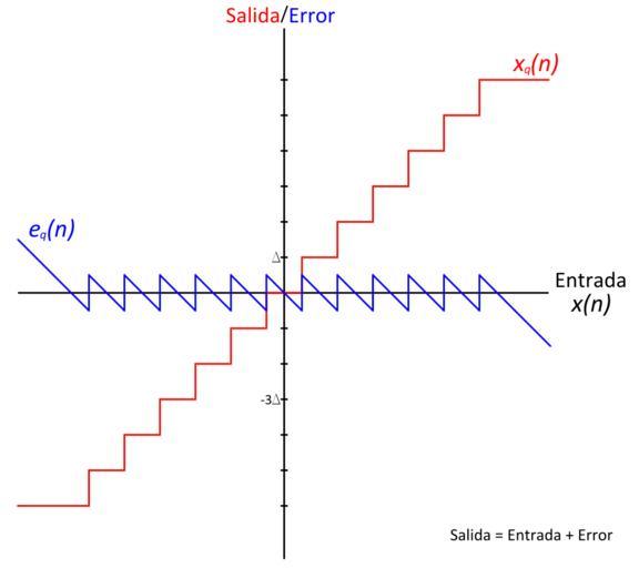 Keywords: FuncionTransferenciaCuantificador.svg Función de transferencia de un cuantificador se muestra error Own 2007-08-08 Jmcalderon Noise physics Quantization