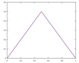 | Keywords: Function x for x smaller 0.5 and 1-x for x bigger 0.5.svg en The function <math>f 0 1\to\R \begin cases x x \le \frac 12 \\ 1-x x > \frac 12\end cases </math> 2016-08-31 own Stephan Kulla other versions Created with Gnuplot set terminal svg set output Function x for x smaller 0 5 and 1-x for x bigger 0 5 svg set samples 1000 set xrange 0 1 set yrange 0 0 6 plot x < 0 5 x 1-x notitle lw 2 cc-zero Function plots Continuity functions Piecewise linear functions | ||||