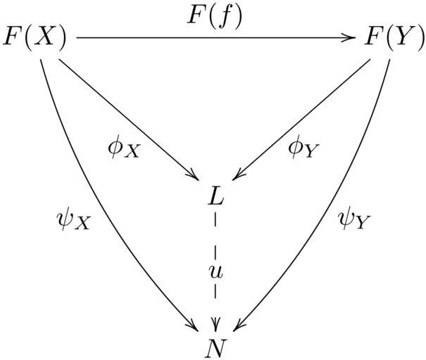 | Keywords: Functor co-cone (extended).svg en A commutative diagram depicting a universal co-cone under a functor Own Ryan Reich 2009-01-14 File FunctorCone-04 png LaTeX source <pre> \documentclass amsart \usepackage amsmath amssymb nopageno \usepackageall xy \begin document \begin equation \xymatrix C+2em R+2em F X \arrr F f F Y \\ L \ar <- ul 0 4 -<1ex 1ex> \phi_X \ar <- ur_ 0 4 -<1ex 1ex> \phi_Y \\ N \ar <- / 10pt/uul \psi_X \ar <- /_10pt/uur_ \psi_Y \ar <-- u +<5pt 5pt> u \end equation \end document </pre> Commutative diagrams Images with LaTeX source code |