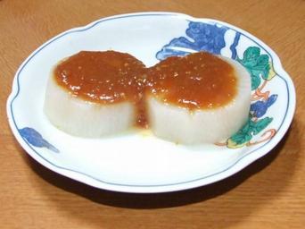 Keywords: Furofukidaikon001.jpg Furofuki-Daikon ja 風呂吹き大根 Photo taken by own 2008-01-05 Babi Hijau See below Nimono Vegetable-based food of Japan Daikon