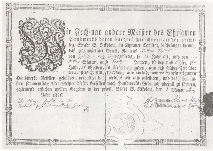 | Keywords: Furriers guild in S. Nikolau, Liptauer Combinat, 1820.jpg  Urkunde der Kürschnerzunft in S Nikolau Liptauer Combinat mittlere Slowakei aus dem Jahr 1820 Wir Zech- und andere Meister des Ehrsamen Handwerks deren bürgerl Kirschnern in der priwileg Stadt S Nikolau in Liptauer Combinat bescheinigen hiemit daß gegenwärtiger Gesell namens Mathias Fajteik von Sejelnitz in Liptz Conitz gebürtig so 18 Jahr alt und von Mittlerer Statur auch tz -Haaren ist bey uns allhier Ein Jahr 26 Wochen in Arbeit gestanden und sich solcher Zeit über treu fleißig still friedsam und ehrlich wie es einen jeglichen Handwerks-Gesellen gebühret verhalten hat welches wir also attestiren und deshalben unsere sammentliche Mit-Meister diesen Gesellen nach Handwerks-Gebrauch überall zu fördern geziemend ersuchen wollen Gegeben in der privil Stadt S Nikolau den 1 Monat May Jahr 1820 Wo obieger Gesell in der Arbeit gestanden; Martz Ober-Zechmeister Adamus Unter-Zechmeister Andreas Marian Šuman-Hreblay Liptovký Mikuláš ČSSR Aus der Geschichte der Kürschnerei von Liptov In Brühl VEB Fachbuchverlag Leipzig 2 März/April 29 1988 ISSN 0007-2664 S 30 1820-05-01 Kürschnerzunft S Nikolau PD-old Furriers in Liptovský Mikuláš |