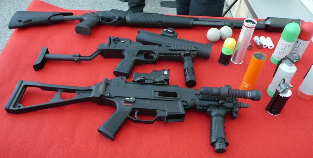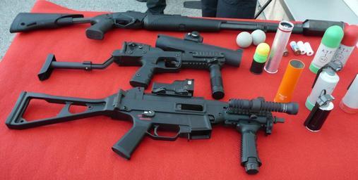 | Keywords: Fusell boler, llançadora i subfusell.JPG en From top to bottom rifle of balls launches rubber balls to long distances GL-06 with the foldable ballistic helmet visor stock launches ping pong balls softer and to a lesser distance and a UMP submachine gun 9mm bullets for roadblocks and raids ca De dalt a baix fusell boler llança boles de goma a llarga distància GL-06 amb el visor plegable llança pilotes ping pong més toves i a menys distància i subfusell bales de 9 mm per controls de carretera i assalts own Galazan 19 de febrer del 2011 Mossos d'Esquadra Riot control Pump-action shotguns B T GL-06 HK UMP Foregrip |