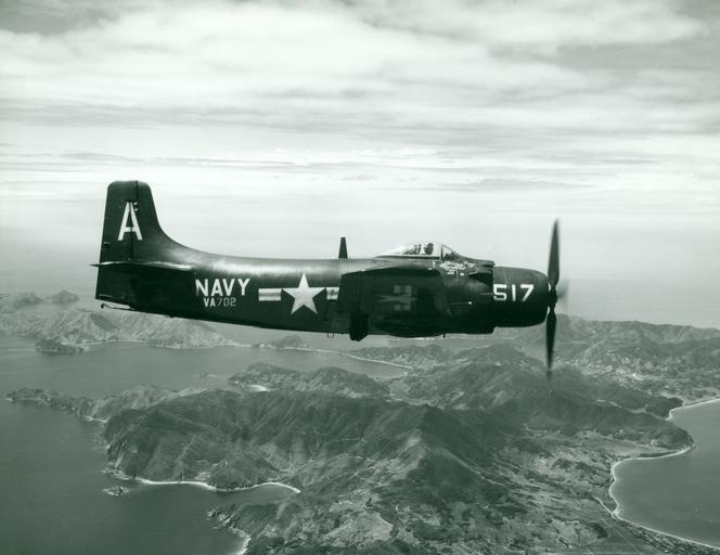 Keywords: outdoor monochrome 80-G-435040. Douglas AD-2 "Skyraider" attack plane (Bureau # 122343), of Attack Squadron 702 (VA-702) Over the Japanese islands, after being launched on a routine flight from USS Boxer (CV-21) in September 1951. The ship was then en route to the Korean combat area. Official U.S. Navy Photograph, now in the collections of the National Archives. 80-G-435040. Douglas AD-2 "Skyraider" attack plane (Bureau # 122343), of Attack Squadron 702 (VA-702) Over the Japanese islands, after being launched on a routine flight from USS Boxer (CV-21) in September 1951. The ship was then en route to the Korean combat area. Official U.S. Navy Photograph, now in the collections of the National Archives. |