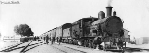| Keywords: G class + Trans-Australian Express, Tarcoola, 1920s.jpg Commonwealth Railways Commonwealth Railways G class G class locomotive with a westbound Trans-Australian Trans-Australian Express at Tarcoola South Australia on the Trans-Australian Railway <p>The number of the locomotive is not clear but it appears to be G20 which was built by Toowoomba Foundry Toowoomba Queensland Australia G20 entered service in June 1917 and was officially withdrawn in May 1952 At the time this photo was taken early in its service life it had a kerosene headlight <p>Some of the information provided here about the image is obtained from Fluck Ronald E; Marshall Barry; Wilson John 1996 Locomotives and Railcars of the Commonwealth Railways Welland SA Gresley Publishing pp 25-29 ISBN 0959969039 1925 https //www flickr com/photos/cpdbear/4517724440/ Flickr - uploader to Flickr claims reproduction rights but image is Public Domain author 30 42 38 9 S 134 34 1 1 E heading E Custom license marker 2014 05 11 PD-Australia Uploaded with UploadWizard 1925 in rail transport in Australia Commonwealth Railways G class locomotives Tarcoola South Australia Trains facing right Trans-Australian Trans Australian railway 1925 in South Australia |
