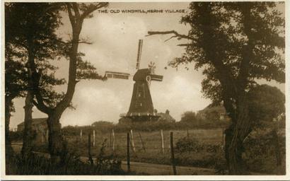 | Keywords: G H Freeman Herne Mill 1920s.jpg Postcard photo of Herne Mill at Herne Kent England The photographer was G H Freeman of 4a Tower Parade Herne Bay Kent The photographer Fred C Palmer sold his Tower Studio around 1920-1922 so this photographer may be his successor This print has darkened with age but it would be inappropriate to adjust the brightness because detail would be lost The postcard border is part of the original vintage artwork It is suggested that edits of this image be uploaded as a separate file ;Points of interest The mill is now surrounded by a housing estate Scan of original postcard in my possession s 1920 not postmarked G H Freeman Out of copyright PD-art Herne Windmill |