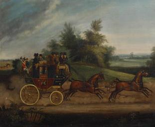 Keywords: G Hulme (attr) Stagecoach racing.jpg The Telegraph stagecoach racing the Pilot' Oil on canvas 59 x 71 cm http //www bonhams com/ Bonhams ~ 1837 attributed to G Hulme PD-old Images from Bonhams Stagecoaches in art 1830s paintings