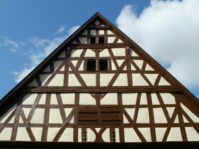 Keywords: gable pediment hockenheim timber framing architecture building old style house classic roof exterior facade historic structure construction handicraft