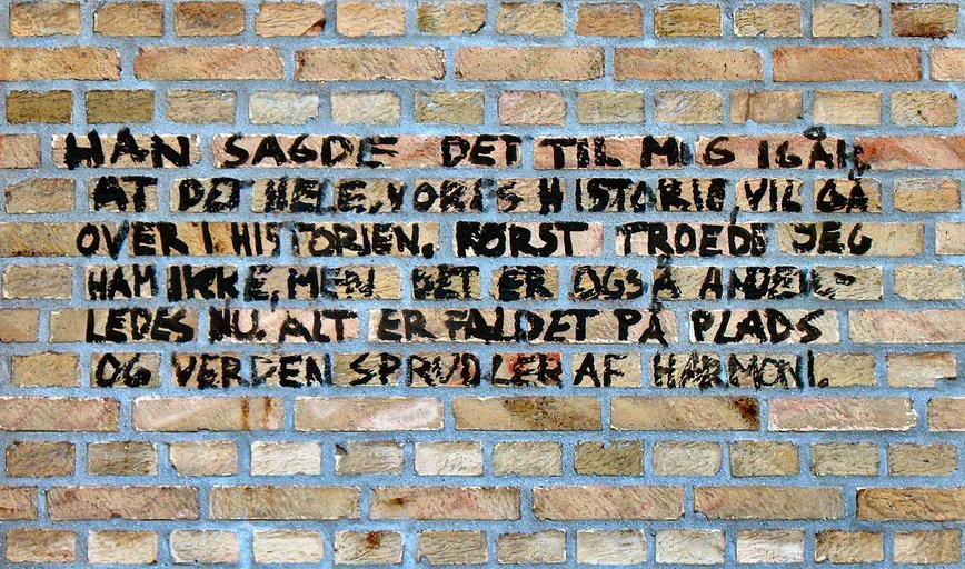 | Keywords: Gadedigt.jpg Poem on brick wall in Århus Denmark Street art Digt skrevet på murstensmur i Århus street art own 2008-07-10 Villy Fink Isaksen at http //da wikipedia org da wikipedia Released into the public domain by the author da wikipedia Villy Fink Isaksen original upload log page da wikipedia Gadedigt jpg 2008-07-10 14 14 Villy Fink Isaksen 1695×1000× 359069 bytes <nowiki> Information digt skrivet på murstensmur i Århus street art fotografi af Villy fink Isaksen 10 juli 2008 Villy Fink Isaksen Eget værk udgives som offentlig ejendom public domain Andre versi</nowiki> Graffiti in Denmark Street art in Aarhus Wall poems |