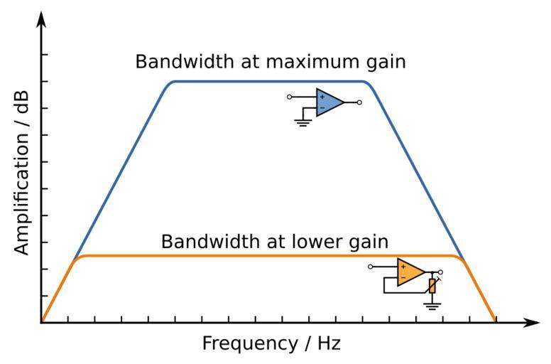 | Keywords: Gain-bandwidth product.svg en A graph of amplifier bandwidth at different gains Adding negative feedback limits the amplification but improves frequency response of the amplifier own Petteri Aimonen 2009-09-28 Translation possible Bode plots Operational amplifiers Negative feedback |