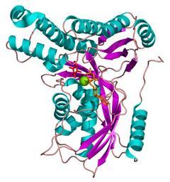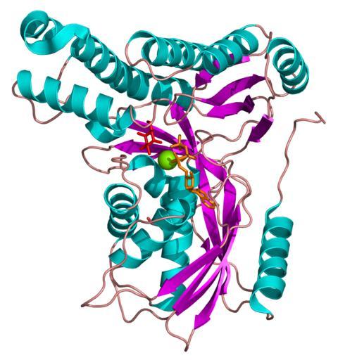 | Keywords: Galactokinase 1 1WUU.png Cartoon diagram of a human galactokinase 1 monomer in complex with galactose red and an analogue of adenosine triphosphate orange A magnesium ion is visible as a green sphere <br>Created using PyMOL http //www pymol org and GIMP Orientation made to match original source From PDB http //www rcsb org/pdb/cgi/explore cgi pdbId 1wuu 1wuu <br/>More information cite journal Thoden JB Timson DJ Reece RJ Holden HM Molecular structure of human galactokinase implications for type II galactosemia J Biol Chem 280 10 9662 “70 2005 March PMID 15590630 http //intl jbc org/cgi/content/full/280/10/9662 10 1074/jbc M412916200 2008-08-08 Fvasconcellos Galactokinase |