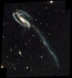 Keywords: galaxy tadpole disrupted barred spiral bright blue star clusters trail gas dust cosmos stellar celestial haze space