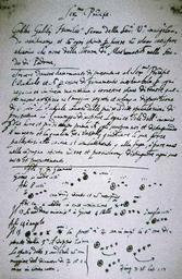 | Keywords: Galileo.script.arp.600pix.jpg of a telescope which had been developed the year before in the Dutch town of Middelburg by an optician one Jan Lippershey Applying his knowledge of optical science Galileo built such a glass or telescope for himself and in the draft letter shown above offers his new occhiale to the Doge of Venice for use in warfare The final letter revised from this draft was sent on August 24 1609 It is in the State Archives in Venice The lower part of this sheet shows the use to which Galileo put this optical device as he viewed the skies on successive evenings in January 1610 he noted his first observations of the planet Jupiter and four of Jupiter's moons This item is cataloged in the collections as Galileo Galilei 1564-1642 Draft of a letter to Leonardo Donato Doge of Venice Circa August 1609 Gift of Tracy W McGregor 1938 According to Scientific American when it was donated it was known to be a draft of the letter in the Venice State Archives but the significance and meaning of the material on the lower half was unrecognized Only in the late 1970s was it determined that these doodles in fact depict the positions of the Galilean moons on the nights in early January when Galileo first observed them thus proving that this document contains the original notes he took on the nights he made his observations See Scientific American article Date late 70s or early 80s The University of Michigan translates the upper half thus Most Serene Prince Galileo Galilei most humbly prostrates himself before Your Highness watching carefully and with all spirit of willingness not only to satisfy what concerns the reading of mathematics in the study of Padua but to write of having decided to present to Your Highness a telescope that will be a great help in maritime and land enterprises I assure you I shall keep this new invention a great secret and show it only to Your Highness The telescope was made for the most accurate study of distances This telescope has the advantage of discovering the ships of the enemy two hours before they can be seen with the natural vision and to distinguish the number and quality of the ships and to judge their strength and be ready to chase them to fight them or to flee from them; or in the open country to see all details and to distinguish every movement and preparation and translation http //www lib umich edu/special-collections-library/galileo-manuscript 1609-1610 Creator Galileo Galilei Public domain PD-old-100 History of astronomy Works of Galileo Galilei Galilean moons Uploads by Mattes from external sources Handwriting |