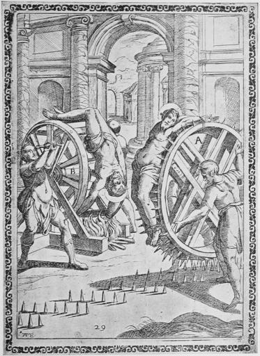 | Keywords: Gallonio Tortures 1591 p08.jpg Woodcut by Tempesta showing a torture/execution scene of martyrs from Gallonio's Tortures and Torments of the Christian Martyrs «Trattato degli instrumenti di martiro e delle varie maniere di martoriare usate da' gentili contro christiani descritti et intagliate in rame; opera di Antonio Gallonio» first publication Rome 1591 / scans from a 1904 reprint woodcut by Antonio Tempesta Reproduction of a painting that is in the public domain because of its age PD-old-100 Trattato degli instrumenti di martiro Breaking wheels |