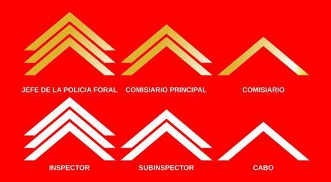 | Keywords: Galones de la Policia Foral.svg en Rank insignia of Policia Foral es Divisas de empleo de la Policia Foral de Navarra own EBNZ 2010-01-12 Galones forales png ORDEN FORAL 85/2008 DE 20 DE FEBRERO DEL CONSEJERO DE PRESIDENCIA JUSTICIA E INTERIOR SOBRE UNIFORMIDAD DISTINTIVOS Y CREDENCIALES DE LA POLICÍA FORAL DE NAVARRA Texto publicado en BON N º 40 de 28 de marzo de 2008 - http //www lexnavarra navarra es/detalle asp r 29592 Policía Foral de Navarra | ||||