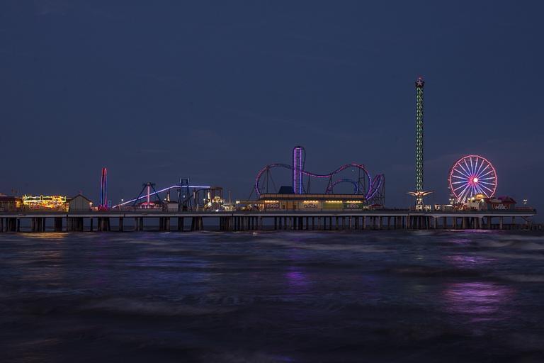 Keywords: galveston amusements skyline texas lights dusk ferris wheel rides pier shore island water reflection gulf of mexico shore historic night twilight evening cityscape landmark