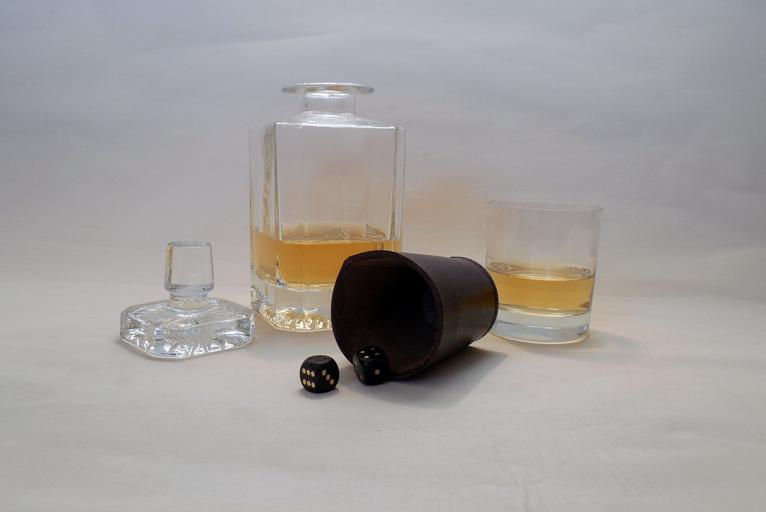 Keywords: gambling cube craps brandy alcohol play whisky whiskey bottle carafe glass drink bar bourbon addiction