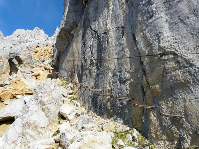 | Keywords: gamsängersteig climbing hunter wall aid shoring metal head iron pins iron brackets clamp iron hook pens climbing aid ellmauer halt red rinn gathered mountains alpine wilderkaiser kaiser mountains medium difficulty exposed climber the rope rock steep |