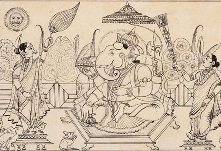 | Keywords: Ganesha ink.jpg Ink drawing of Ganesha under an umbrella with his two wives who are fanning him His rat is in the foreground to the left The sun with a face shines upon the scene Various trees in the background Ganesja under ein parasoll med dei to konene sine som vifter han Sol med fjes i himmelen rotta han rir på i forgrunnen tre i bakgrunnen India Karnataka Mysore Bhagavata Purana Ancient Stories of the Lord Manuscript Museum Number M 91 349 4 LACMA http //www mythfolklore net/india/galleries/2/ganesha_ink htm early 19th century author PD-art Paintings of Ganesha Ink drawings 19th-century drawings Drawings of people of India Bhagavata Purana Paintings from Karnataka Polygamy Drawings from India in the Los Angeles County Museum of Art Mysore in the 1800s Chamara Rats in art 1800s paintings from India Manuscripts from India in the Los Angeles County Museum of Art |