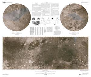 | Keywords: Ganymede USGS map.jpg LargeImage en Prepared on behalf of the Planetary Geology and Geophysics Program Solar System Exploration Division Office of Space Science National Aeronautics and Space Administration NOTES ON BASE This sheet is one in a series of maps of the Galilean satellites of Jupiter at a nominal scale of 1 15 000 000 This series is based on data from the Galileo Orbiter Solid-State Imaging SSI camera and the Voyager 1 and 2 spacecraft PROJECTION Mercator and Polar Stereographic projections used for this map of Ganymede are based on a sphere having a radius of 2632 345 km The scale is 1 8 388 000 at ±56° latitude for both projections Longitude increases to the west in accordance with the International Astronomical Union 1971 Davies and others 1996 Latitude is plan- etographic CONTROL The geometric control network was computed at the RAND Corporation Davies and others 1998; Davies and Katayama 1981 This map of Ganymede utilized RAND ™s most recent solution as of November 1999 This process involved selecting control points on the individual images making pixel measurements of their locations using reseau locations to correct for geometric distortions and converting the measurements to millimeters in the focal plane These data are combined with the camera focal lengths and navigation solutions as input to photogrammetric triangulation software that solves for the best-fit sphere the coordinates of the control points the three orien- tation angles of the camera at each exposure right ascension declination and twist and an angle W0 which defines the orientation of Ganymede in space W0 ”in this solution 44 064° ”is the angle along the equator to the east between the 0° meridian and the equator ™s intersection with the celestial equator at the standard epoch J2000 0 This solution places the crater Anat at its defined longitude of 128° Davies and oth- ers 1996 MAPPING TECHNIQUE This global map base uses the best image quality and moderate resolution coverage supplied by Galileo SSI and Voyager 1 and 2 Batson 1987; Becker and others 1998; Becker and others 1999; Becker and others 2001 The monochrome and color data were both processed using Integrated Software for Imagers and Spectrometers ISIS Eliason 1997; Gaddis and others 1997; Torson and Becker 1997 The individual images were radiometrically calibrated and photometrically normalized using a Lunar- Lambert function with empirically derived values McEwen 1991; Kirk and others 2000 A linear correction based on the statistics of all overlapping areas was then applied to minimize image brightness variations The image data were selected on the basis of overall image quality reasonable original input resolution from 20 km/pixel for gap fill to as much as 180 m/pixel and availability of moderate emission/inci- dence angles for topography and albedo The black and white monochrome base mosaic was constructed separately from the three-band color mosaic Although consis- tency was achieved where possible different filters were included for the mono- chrome global image coverage as necessary clear for Voyager 1 and 2; clear near-IR 757 nm and green 559 nm for Galileo SSI Individual images were projected to a Sinusoidal Equal-Area projection at an image resolution of 1 0 km/pixel The global color map was processed in Sinusoidal projection with an image resolution of 6 0 km/pixel The color utilized the SSI filters 1-micron 991 nm wavelength for red SSI 559 nm for green and SSI 413 nm for violet Where SSI color coverage was lacking in the longitude range of 210° “250° Voyager 2 wide-angle images were included to complete the global coverage The chosen filters for the Voyager 2 data were ~530 nm for green and ~480 “500 nm for blue The red band was synthesized in this area based on statistics calculated from the surrounding SSI 1-micron 991 nm data and SSI and Voyager data in the green and blue bands The final global color map was then scaled up to 1 0 km/pixel and merged with the monochrome base mosaic The north pole and south pole regions that lack digital color coverage have been completed with the monochrome map coverage The final constructed Sinusoidal projection mosaic was then reprojected to the Mercator and Polar Stereographic projections included on this sheet The color of the final mosaic was enhanced using commercial software NOMENCLATURE Names on this sheet are approved by the International Astronomical Union IAU 1980 1986 1999 and 2001 Names have been applied for features clearly visible at the scale of this map; for a complete list of nomenclature for Ganymede please see http //planetarynames wr usgs gov http //geopubs wr usgs gov/i-map/i2762/ USGS 2002-01-17 Maps of Ganymede PD-USGov |