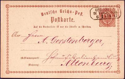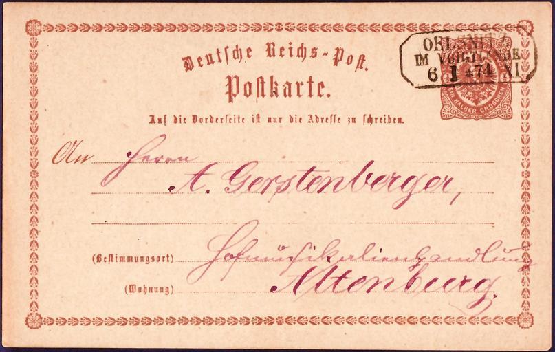 | Keywords: Ganzsachenkarte Oelsnitz 1874 B001.jpg Ganzsachen-Karte der Deutschen Reichspost von Oelsnitz im Vogtland Sachsen nach Altenburg im damaligen Herzogtum Sachsen-Altenburg vom 6 Januar 1874; ½ Groschen braun achteckiger Kastenstempel Postal stationery card of the Deutsche Reichspost from Oelsnitz in the Vogtland Saxony to Altenburg in the former Duchy of Saxony-Altenburg of the 6th January 1874; ½ Groschen; brown; octagonal box postmark scan of original other date 1874-01-06 date of postmark Deutsche Reichspost Postal stationery of Germany Postmarks of Saxony Reichspost PD-old |