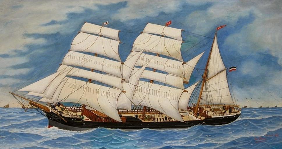 | Keywords: Garb Römer - Schiffsporträt der Windsbraut aus Elsfleth 1897 auf der Nordsee.jpg Die Windsbraut war eine Bark aus Elsfleth Sie war 68 m lang 11 m breit 6 7 m tief und war vermessen mit 1256 Tonnen Sie wurde 1877 als John Paterson von P Hardcastle Co in Sunderland UK gebaut Erster Eigner war Ths Clarke in Irvine UK 1889 wurde sie nach Deutschland verkauft und in Windsbraut umbenannt Eigner war Carl H H Winters aus Elsfleth 1903 wurde das Schiff nach Norwegen verkauft und in Columbia umbenannt Das Schiff ging 1906 vor Falmouth verloren <ref>http //www fineartemporium com/se-Roemer-Windsbraut1 htm nach Bild-info bei fineartemporium com</ref> reflist 1897 oil board cm 54 99 private collection The Hague object history credit line accession number http //www fineartemporium com/se-Roemer-Windsbraut1 htm fineartemporium com PD-Art-100 Windsbraut ship 1877 19th-century sailing ships in paintings 1897 paintings |