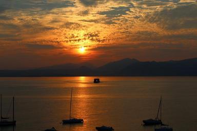 Keywords: garda sunset evening mood lake abendstimmung romance ferry holiday water clouds evening sky sun sky sailing boats nature