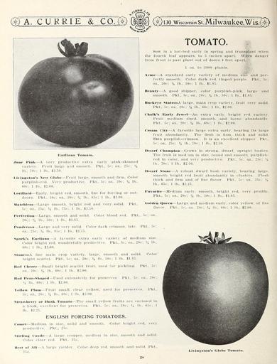 | Keywords: Garden and farm seeds (15750239474).jpg aTc u r rTe~ tco M ill <br> –º – UlKtJfc <br> 1 130 Wisconsin Si Milwaukee Wis <br> TOMATO <br> Enrlinna Tomato <br> June Pink ” A very productive extra early pink-skinned <br> variety Fruit large and smooth Pkt 5e; oz 25c; <br> lb 70c; 1 lb 2 50 <br> Livingston's New Globe ” Fruit large smooth and firm Color <br> purplish-red Very productive Pkt 5c; oz 20c; lb <br> 60c; 1 lb 2 00 <br> Lorillard ” Early bright red smooth fine for forcing or out- <br> doors Pkt 10c; oz 30c; lb 85c; 1 lb 3 00 <br> Matchless ” Large smooth bright red and very solid Pkt <br> 5c; oz 25c; 4 lb 75c; 1 lb 2 50 <br> Sow in a hot-bed early in spring and transplant when <br> the fourth leaf appears to 3 inches apart When danger <br> from frost is past plant out of doors 4 feet apart <br> 1 oz to 3000 plants <br> Aeme ” A standard early variety of medium size' and per- <br> fectly smooth Color dark red tinged purple Pkt 5c; <br> oz 20c; lb 50c; 1 lb ž 1 85 <br> Beauty ” A good shipper color purplish-pink large and <br> smooth ' Pkt 5c; oz 20c; lb 50c; 1 lb 1 85 <br> Buekeye State ” A large main crop variety fruit very solid <br> Pkt 5c oz 20c; lb 60c; 1 lb 2 00 <br> Chalk's Early Jewel ” -An extra early bright red variety <br> Fruit medium sized smooth and borne abundantly <br> Pkt 5c; oz 20c; lb 60c; 1 lb ž 2 00 <br> Cream City ” A favorite large extra early bearing' its large <br> fruit abundantly The flesh is firm thick and solid <br> Skin purplish-crimson It is an excellent shipper Pkt <br> 5c; oz ž 25c; lb 70c; 1 lb 2 50 <br> Dwarf Champion ” Grows in strong' dwarf upright bushes <br> The fruit is medium in size round and smooth purplish- <br> red in color and very productive Pkt 5c; qz 25c; <br> lb 70c; 1 lb 2 50 <br> Dwarf Stone ” A robust dwarf bush variety bearing large <br> smooth bright red fruit abundantly in clusters Flesh <br> thick and firm and of fine flavor Pkt 5c; oz 25c; <br> lb 65c; 1 lb 2 25 <br> Favorite ” Medium early smooth bright red very prolific <br> Pkt 5c; oz 20c; lb 50c; 1 lb 1 85 <br> Golden ftneen ” Large and medium early color yellow of fine <br> flavor Pkt 5c; oz 20c; lb 60c; 1 lb 2 00 <br> Perfeetion ” Large smooth and solid Color blood red Pkt 5c; oz <br> 20c; 14 lb 50c; 1 lb 1 85 <br> Ponderosa ” Large and very solid Color dark crimson late Pkt 5c; <br> oz 25c; 14 lb 85c; 1 lb 2 75 <br> Spark's Karliana ” A favorite extra early variety of medium size <br> Color bright red wonderfully productive Pkt 5c; oz 20c; lb <br> 60e; 1 lb 2 00 <br> Stone ” A fine main crop variety large smooth and solid Color <br> bright scarlet Pkt 5c; oz 20c; lb 50c; 1 lb 1 85 <br> Bert Cherry ” Small bright scarlet fruit used for pickling Pkt 5c; <br> oz 20c; lb 60c; 1 lb 2 00 <br> Bert Pear-Shaped ” Used extensively for preserves Pkt 5c; oz 20c; <br> 14 lb 60c; 1 lb 2 00 <br> Yellow Plum ” Fruit small clear yellow used for preserves Pkt <br> 5c; oz 20c; lb 60c; 1 lb 2 00 <br> Strawberry or Hu sk Tomato ” The small yellow fruits are enclosed in <br> a husk excellent for preserves Pkt 5c; oz 20c; V4 lb 65e; 1 <br> lb 2 25 <br> ENGLISH FORCING TOMATOES <br> Comet ” Medium in size solid and smooth Color bright red very <br> productive Pkt 25c <br> Stirling t'a stle ” A large cropper medium in size smooth and solid <br> Color clear red Pkt 25c <br> Best of All ” -V large yielder Color deep red smooth and solid Pkt <br> 25 c <br> 2S <br> ilvinsrston's Globe Toinnln 42156480 132761 65916 Page 28 Text http //www biodiversitylibrary org/page/42156480 1912 10 5962/bhl title 65916 A Currie Company ; Henry G Gilbert Nursery and Seed Trade Catalog Collection NameFound Medium NameConfirmed Medium NameBankID 4904049 Biodiversity Heritage Library Garden and farm seeds spring 1912 Garden Stories Bulbs Plants Catalogs Equipment and supplies Flowers Gardening Nurseries Horticulture Plants Ornamental Seeds Vegetables U S Department of Agriculture National Agricultural Library bhl page 42156480 dc identifier http //biodiversitylibrary org/page/42156480 bhlGardenStories BHLinbloom bulbs plants nurseries horticulture plants ornamental u s department of agriculture national agricultural library bhlgardenstories bhlinbloom Information field Flickr posted date ISOdate 2015-01-26 Check categories 2015 August 25 CC-BY-2 0 BioDivLibrary https //flickr com/photos/61021753 N02/15750239474 2015-08-25 06 53 36 cc-by-2 0 PD-old-70-1923 Garden and farm seeds 1912 Photos uploaded from Flickr by Fæ using a script |