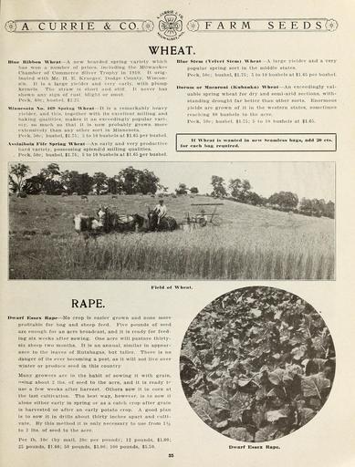 | Keywords: Garden and farm seeds (15752706183).jpg vjttfc't <br> A CURRIE CO <br> FARM SEEDSi <br> WHEAT <br> Blue Ribbon Wheat A new bearded spring variety which <br> lias won a number of prizes including' the Milwaukee <br> Chamber of Commerce Silver Trophy in 1910 It orig- <br> inated with Mr H E Krueger Dodge County Wiscon- <br> sin It is a large yielder and very early with plump <br> kernels The straw is short and stiff It never has <br> shown any sign of rust blight or smut <br> Peck 60c; bushel 2 25 <br> Minnesota No 1 ยป Spring Wheat It is a remarkably heavy <br> yielder and this together with its excellent milling and <br> baking qualities makes it an exceedingly popular vari- <br> ety so much so that it is now probably grown more <br> extensively than any other sort in Minnesota <br> Peck 50c; bushel 1 75 ; 5 to 10 bushels at 1 65 per bushel <br> Assiuiboia Fife Spring Wheat An early and very productive <br> hard variety possessing splendid milling qualities <br> Peck 50c; bushel 1 75; 5 to 10 bushels at 1 65 p_er bushel <br> Blue Stem Velvet Stem Wheat A large yielder and a very <br> popular spring sort in the middle states <br> Peck 50c; bushel 1 75; 5 to 10 bushels at 1 65 per bushel <br> Durum or Macaroni Kubanka Wheat An exceedingly val- <br> uable spring wheat for dry and semi-arid sections with- <br> standing drought far better than other sorts Enormous <br> yields are grown of it in the western states sometimes <br> reaching 80 bushels to the acre <br> Peck 50c; bushel 1 75; 5 to 10 bushels at 1 65 <br> If Wheal is wanted in new Seamless bags add 20 cts <br> for each bag required <br> Meld of Wheat <br> RAPE <br> Dwarf Essex Rape No crop is easier grown and none more <br> profitable for hog and sheep feed Five pounds of seed <br> are enough for an acre broadcast and it is ready for feed- <br> ing six weeks after sowing One acre will pasture thirty- <br> six sheep two months It is an annual similar in appear- <br> ance to the leaves of Rutabagas but taller There is no <br> danger of its ever becoming a pest as it will not live over <br> winter or produce seed in this country <br> Many growers are in the habit of sowing it with grain <br> sing about 2 lbs of seed to the acre and it is ready t ~ <br> use a few weeks after harvest Others sow it in corn at <br> the last cultivation The best way however is to sow it <br> alone either early in spring or as a catch crop after grain <br> is harvested or after an early potato crop A good plan <br> is to sow it in drills about thirty inches apart and culti- <br> vate By this method it is only necessary to use from 1 <br> to 2 lbs of seed to the acre <br> Per lb 10c by mail 20c per pound ; 12 pounds 1 00; <br> 25 pounds 1 60; 50 pounds 3 00; 100 pounds 5 50 <br> Dwarf Essex Rape <br> 35 42156487 132761 65916 Page 35 Text http //www biodiversitylibrary org/page/42156487 1912 10 5962/bhl title 65916 A Currie Company ; Henry G Gilbert Nursery and Seed Trade Catalog Collection NameFound Assiuiboia Biodiversity Heritage Library Garden and farm seeds spring 1912 Garden Stories Bulbs Plants Catalogs Equipment and supplies Flowers Gardening Nurseries Horticulture Plants Ornamental Seeds Vegetables U S Department of Agriculture National Agricultural Library bhl page 42156487 dc identifier http //biodiversitylibrary org/page/42156487 bhlGardenStories BHLinbloom bulbs plants nurseries horticulture plants ornamental u s department of agriculture national agricultural library bhlgardenstories bhlinbloom Information field Flickr posted date ISOdate 2015-01-26 Check categories 2015 August 25 CC-BY-2 0 BioDivLibrary https //flickr com/photos/61021753 N02/15752706183 2015-08-25 06 53 47 cc-by-2 0 PD-old-70-1923 Garden and farm seeds 1912 Photos uploaded from Flickr by Fรฆ using a script |