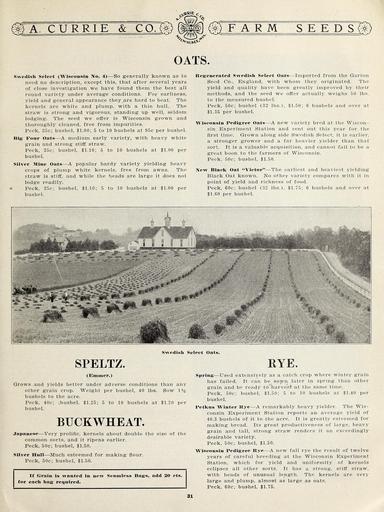 | Keywords: Garden and farm seeds (16250337368).jpg except this that after several years <br> of close investigation we have found them the best all <br> round variety under average conditions For earliness <br> yield and general appearance they are hard to beat The <br> kernels are white and plump with a thin hull The <br> straw is strong and vigorous standing up well seldom <br> lodging The seed we offer is Wisconsin grown and <br> thoroughly cleaned free from impurities <br> Peck 35c; bushel 1 00; 5 to 10 bushels at 95c per bushel <br> Big Four Oats ” A medium early variety with heavy white <br> grain and strong stiff straw <br> Peck 35c; bushel 1 10; 5 to 10 bushels at 1 00 per <br> bushel <br> Silver Mine Oats ” A popular hardy variety yielding heavy <br> crops of plump white kernels free from awns The <br> straw is stiff and while the heads are large it does not <br> lodge readily <br> Peck 35c; bushel 1 10; 5 to 10 bushels at 1 00 per <br> bushel <br> Regenerated Swedish Select Oats ” Imported from the Garton <br> Seed Co England with whom they originated The <br> yield and quality have been greatly improved by their <br> methods and the seed we offer actually weighs 50 lbs <br> to the measured bushel <br> Peck 50c; bushel 32 lbs 1 50; 6 bushels and over at <br> 1 35 per bushel <br> Wisconsin Pedigree Oats ” A new variety bred at the Wiscon- <br> sin Experiment Station and sent out this year for the <br> first time Grown along side Swedish Select it is earlier <br> a stronger grower and a far heavier yielder than that <br> sort It is a valuable acquisition and cannot fail to be a <br> great boon to the farmers of Wisconsin <br> Peck 50c; bushel 1 50 <br> New Black Oat Victor ” The earliest and heaviest yielding <br> Black Oat known No other variety compares with it in <br> point of yield and richness of food <br> Peck 60c; bushel 32 lbs 1 75; 6 bushels and over at <br> 1 60 per bushel <br> -V £ £ ££ '» – -- Mr <br> – z <br> Jami 3Smi Sm <br> Swedish Select Oats <br> SPELTZ <br> Emmer <br> Grows and yields better under adverse conditions than any <br> other grain crop Weight per bushel 40 lbs Sow 1 <br> bushels to the acre <br> Peck 40c; ;bushel 1 25; 5 to 10 bushels at 1 20 per <br> bushel <br> BUCKWHEAT <br> Japanese ” Very prolific kernels about double the size of the <br> common sorts and it ripens earlier <br> Peck 50c; bushel 1 50 <br> Silver Hull ” Much esteemed for making flour <br> Peck 50c; bushel 1 50 <br> If Grain is wanted in new Seamless Bags add 20 cts <br> for each bag required <br> EYE <br> Spring ” Used extensiyely as a catch crop where winter grain <br> has failed It can be sown later in spring than other <br> grain and be ready to ~harvest -at the same time <br> Peck 50c; bushel 1 50; 5 to 10 bushels at 1 40 per <br> bushel <br> Petkus Winter Rye ” A remarkably heavy yielder The Wis- <br> consin Experiment Station reports an average yield of <br> 40 3 bushels of it to the acre It is greatly esteemed for <br> making bread Its great productiveness of large heavy <br> grain and tall strong straw renders it an exceedingly <br> desirable variety <br> Peck 50c; bushel 1 50 <br> Wisconsin Pedigree Rye ” A new fall rye the result of twelve <br> years of careful breeding at the Wisconsin Experiment <br> Station which for yield and uniformity of kernels <br> eclipses all other sorts It has a strong stiff straw <br> with heads of unusual length The kernels are very <br> large and plump almost as large as oats <br> Peck 60c; bushel 1 75 <br> 31 42156393 132760 65915 Page 31 Text http //www biodiversitylibrary org/page/42156393 1913 10 5962/bhl title 65915 A Currie Company ; Henry G Gilbert Nursery and Seed Trade Catalog Collection Biodiversity Heritage Library Garden and farm seeds spring 1913 um Garden Stories Bulbs Plants Catalogs Equipment and supplies Flowers Gardening Nurseries Horticulture Plants Ornamental Seeds Vegetables U S Department of Agriculture National Agricultural Library bhl page 42156393 dc identifier http //biodiversitylibrary org/page/42156393 bhlGardenStories Oats A Currie Co BHLinbloom bulbs plants nurseries horticulture plants ornamental u s department of agriculture national agricultural library bhlgardenstories a currie co bhlinbloom Information field Flickr posted date ISOdate 2015-02-03 Check categories 2015 August 25 CC-BY-2 0 BioDivLibrary https //flickr com/photos/61021753 N02/16250337368 2015-08-25 01 50 52 cc-by-2 0 PD-old-70-1923 Garden and farm seeds 1913 Photos uploaded from Flickr by Fæ using a script |