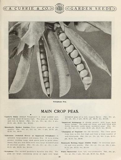 | Keywords: Garden and farm seeds (16346696116).jpg A CURRIE Cd l ijli <br> GARDEN S E E D ST 1 <br> Telephone Pea <br> MAIN CROP PEAS <br> – Carter's Daisy Dwarf Telephone ” A large podded sort <br> growing about 18 inches high The peas are very large <br> and rich in flavor Pkt 10c; pt 25c; qt 45c; 4 qts <br> 1-50; pk 2 65; bu 10 00 <br> ™¦Horsford's Market Garden ” Very productive and of fine <br> quality Pkt 10c; pt 25c; qt 40c; 4 qts 1 35; pk <br> 2 35; bu 9 00 <br> Alderman Admiral Dewey or Improved Telephone ” A <br> splendid large-podded mid-season Pea It is a strong <br> grower yielding large dark green pods in great abun- <br> dance that are well filled with very large wrinkled peas <br> of excellent quality Pkt 10c; pt 25c; qt 45c; 4 qts <br> 1 65; pk 3 25; bu 12 00 <br> wrinkled peas of a rich sugary flavor Pkt 10c; pt <br> 25c; qt 45c; 4 qts 1 65; pk 3 25; bu 12 00 <br> ™¦Improved Stratagem ” A strong grower with large dark <br> green foliage The pods are large and well filled with <br> richly flavored extra large wrinkled peas Pkt 10c; <br> pt 25c; qt 45c; 4 qts 1 65; pk 3 25; bu 12 00 <br> ™¦Champion of England ” An old favorite The vines grow <br> from four to five feet high and bear a large number of <br> well filled pods Pkt 10c; pt 25c; qt 40c; 4 qts 1 35; <br> pk 2 35; bu 9 00 <br> Mammoth Melting Sugar Edible Pods ” Of delicious qual- <br> ity and very prolific Pkt 10c; pt 25c; qt 50c; 4 qts <br> 1 75; pk 3 25; bu 12 00 <br> ™¦Telephone ” The market gardener's favorite late Pea The White Marrowfat ” Late tall very productive Pkt 10c; pt <br> pods are large containing seven or eight very large 15c; qt 25c; 4 qts 85c; pk 1 50; bu 5 00 <br> 21 42156473 132761 65916 Page 21 Text http //www biodiversitylibrary org/page/42156473 1912 10 5962/bhl title 65916 A Currie Company ; Henry G Gilbert Nursery and Seed Trade Catalog Collection Biodiversity Heritage Library Garden and farm seeds spring 1912 Garden Stories Bulbs Plants Catalogs Equipment and supplies Flowers Gardening Nurseries Horticulture Plants Ornamental Seeds Vegetables U S Department of Agriculture National Agricultural Library bhl page 42156473 dc identifier http //biodiversitylibrary org/page/42156473 bhlGardenStories BHLinbloom bulbs plants nurseries horticulture plants ornamental u s department of agriculture national agricultural library bhlgardenstories bhlinbloom Information field Flickr posted date ISOdate 2015-01-26 Check categories 2015 August 25 CC-BY-2 0 BioDivLibrary https //flickr com/photos/61021753 N02/16346696116 2015-08-25 06 52 56 cc-by-2 0 PD-old-70-1923 Garden and farm seeds 1912 Photos uploaded from Flickr by Fæ using a script |