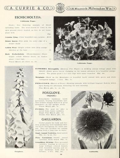Keywords: Garden and farm seeds (16346757266).jpg «£lC- r <br> A C U RRIE CO TO UBM; 4 t30 Wisconsin St Milwauk ee WJS 5fi <br> ESCHSCHOLTZIA <br> California Poppy <br> Showy free flowering- annuals of dwarf <br> spreading' habit The seed should be sown in the <br> open ground where wanted as they do not trans- <br> plant well <br> Pkt <br> Carmine King- ” Color beautiful rose-carmine 0 05 <br> Dainty Queen ” Pale pink the outer edg-e of a <br> deeper shade <br> Golden West ” Bright yellow with deep orange <br> blotches at the base <br> nush Eselisoliolt/ ia Hunnemannia ” Bears <br> bright yellow flowers freely on bushes <br> about 2 feet high <br> Finest Mixed all colors oz 20c <br> 05 <br> 05 <br> 05 <br> 05 <br> California Poppy <br> EUPHORBIA Heterophil Mexican Fire Plant ” A striking annual foliage plant with <br> smooth glossy green leaves changing as the season advances to a beautiful orange- <br> scarlet The plants grow 3 to 4 feet high with many branches Pkt 10c <br> Mnrginata Snow on the Mountain ” A beautiful hardy annual with green and white <br> variegated foliage 2 feet Pkt 5c <br> POUR O'CLOCK Marvel of Peru ” Showing annuals with brilliant fragrant flowers which <br> open during the afternoon withering the next morning <br> Fine Mixed pkt 5c; oz 10c <br> foxglov <br> FOXGLOVE <br> Digitalis <br> Remarkably handsome hardy <br> perennials bearing beautifully mot- <br> tled thimble-shaped flowers in great <br> abundance on tall upright stems <br> Finest Mixed pkt 5c <br> FUCHSIA ” The seed we offer is <br> saved from choice varieties <br> Single Fine Mixed pkt 15c <br> Double Fine Mixed pkt 15c <br> GAILLARDIA <br> Useful plants for beds and bor- <br> ders producing their handsome flow- <br> ers freely throughout the entire sea- <br> son They are excellent for cutting <br> keeping fresh a long time in water <br> Single Annual Varieties finest mixed <br> Pkt 5c; oz 15c <br> Picta l orenziana ” Double annual <br> varieties finest mixed Pkt 5c <br> Grandlflora Hybriila ” New perennial <br> varieties bearing profusely <br> large brilliant colored flowers <br> with beautiful maroon and or- <br> ange markings from June to <br> October 2 feet Pkt 10c <br> tialllarilia <br> 42156508 132761 65916 Page 56 Text http //www biodiversitylibrary org/page/42156508 1912 10 5962/bhl title 65916 A Currie Company ; Henry G Gilbert Nursery and Seed Trade Catalog Collection NameFound Eschscholtzia NameConfirmed Eschscholtzia EOLID 2886433 NameBankID 2560248 NameFound Euphorbia NameConfirmed Euphorbia succulent spp EOLID 20197 NameFound Gaillardia NameConfirmed Gaillardia Foug EOLID 38325 NameFound Hunnemannia NameConfirmed Hunnemannia Sweet EOLID 72891 NameFound Hybriila NameFound Picta NameConfirmed Picta NameBankID 5100567 Biodiversity Heritage Library Garden and farm seeds spring 1912 Garden Stories Bulbs Plants Catalogs Equipment and supplies Flowers Gardening Nurseries Horticulture Plants Ornamental Seeds Vegetables U S Department of Agriculture National Agricultural Library bhl page 42156508 dc identifier http //biodiversitylibrary org/page/42156508 bhlGardenStories BHLinbloom bulbs plants nurseries horticulture plants ornamental u s department of agriculture national agricultural library bhlgardenstories bhlinbloom Information field Flickr posted date ISOdate 2015-01-26 Check categories 2015 August 25 CC-BY-2 0 BioDivLibrary https //flickr com/photos/61021753 N02/16346757266 2015-08-25 06 53 30 cc-by-2 0 PD-old-70-1923 Garden and farm seeds 1912 Photos uploaded from Flickr by Fæ using a script