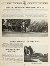 | Keywords: Garden and farm seeds (16371816082).jpg R'E <br> A CURRIE COM <br> GRASS SEEDS <br> LAWN GRASS MIXTURE FOR SHADY PLACES <br> If wanted by mail add 10c per lb for postage out the entire season It frequently happens that the ground <br> To maintain a nice growth of grass under trees and in under trees becomes impoverished by the roots of the trees <br> places where the sunlight only reaches part of the day was making it almost impossible for grass to thrive unless a lib- <br> long considered almost hopeless This can now be overcome eral top dressing of fertilizer is supplied or when the ground <br> in a great measure by using our mixture which is composed has soured and covered with moss an application of ground <br> of dwarf compact growing' grasses that naturally grow in lime will be found beneficial before sowing the seed <br> partial shade and will maintain a close thick turf through- Per lb 40c; 5 lbs 1 85; 20 lbs 7 00; 10ft lbs 35 00 <br> Grass Mixture for Shady Places <br> GRASS MIXTURE FOR TERRACES <br> This mixture is made up of line dwarf growing <br> grasses with strong creeping and fibrous roots that form <br> a compact growth of turf resisting drought and exposure <br> remarkably well and when established prevents washing <br> Per lb 35c; 5 lbs 1 65; 20 lbs 6 00; 100 lbs 30 00 <br> LAKESIDE GRASS <br> MIXTURE <br> This mixture is specially prepared for country homes <br> where a close even velvety turf is not easily secured <br> owing to the difficulty of watering etc so necessary for <br> the maintenance of a perfect lawn The grasses used are <br> such as endure drought and rough usage to a remarkable <br> degree <br> We have made up this mixture in a great measure <br> for the formation of lawns at Lakeside Summer Homes <br> that can only have attention during the summer months <br> and for this purpose it will be found invaluable <br> Per lb 25c; 5 lbs 1 20; 10 lbs 2 30; 25 lbs 5 25; <br> 100 lbs 20 00 <br> Grass Mixture for Terraces <br> 43 42156495 132761 65916 Page 43 Text http //www biodiversitylibrary org/page/42156495 1912 10 5962/bhl title 65916 A Currie Company ; Henry G Gilbert Nursery and Seed Trade Catalog Collection Biodiversity Heritage Library Garden and farm seeds spring 1912 Garden Stories Bulbs Plants Catalogs Equipment and supplies Flowers Gardening Nurseries Horticulture Plants Ornamental Seeds Vegetables U S Department of Agriculture National Agricultural Library bhl page 42156495 dc identifier http //biodiversitylibrary org/page/42156495 bhlGardenStories BHLinbloom bulbs plants nurseries horticulture plants ornamental u s department of agriculture national agricultural library bhlgardenstories bhlinbloom Information field Flickr posted date ISOdate 2015-01-26 Check categories 2015 August 25 CC-BY-2 0 BioDivLibrary https //flickr com/photos/61021753 N02/16371816082 2015-08-25 06 53 09 cc-by-2 0 PD-old-70-1923 Garden and farm seeds 1912 Photos uploaded from Flickr by Fæ using a script |